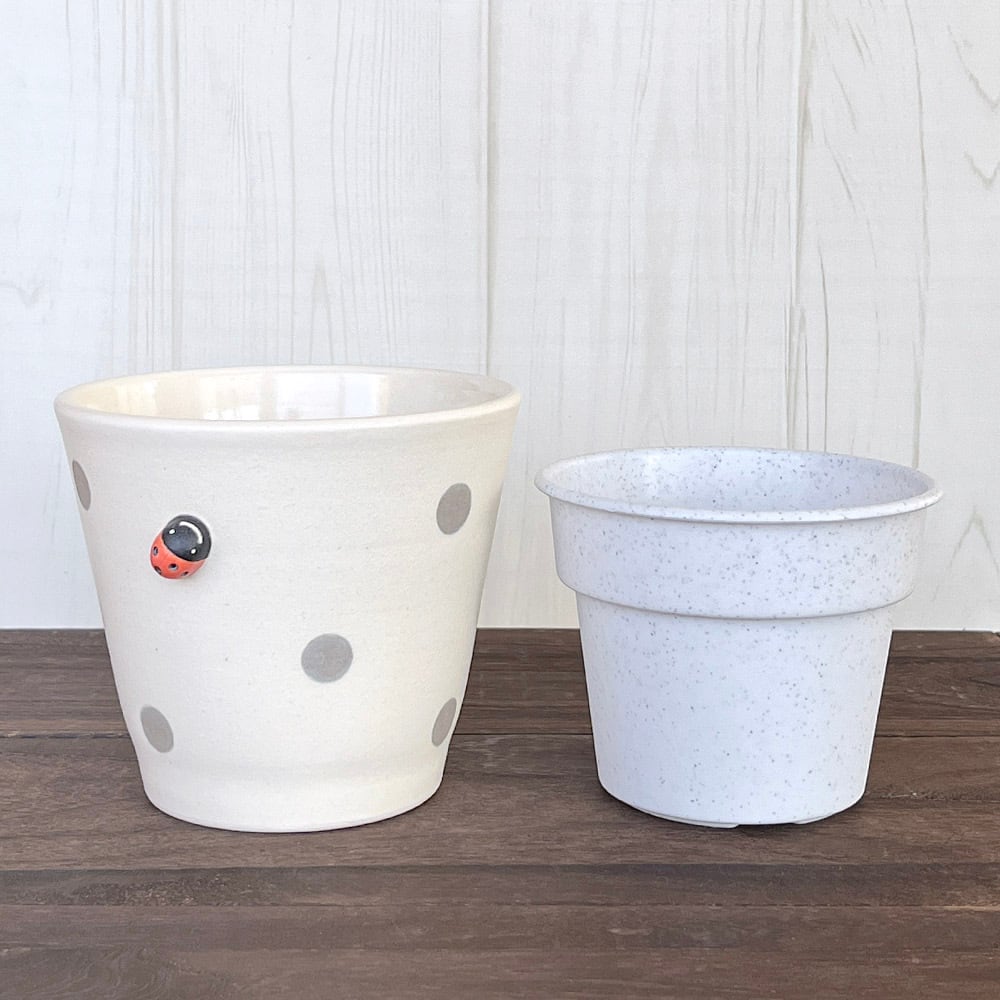 市販のプラスチックの植木鉢(4号)とセットなので、お手持ちの植物を植え替えれば、鉢カバーとピッタリサイズでお使いいただけます。